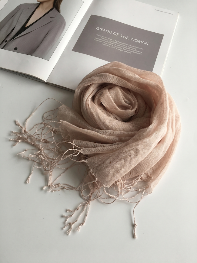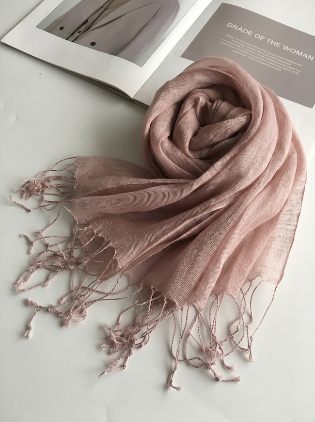 A lightweight fringed scarf in a muted blush tone, designed for effortless layering and soft, everyday elegance.