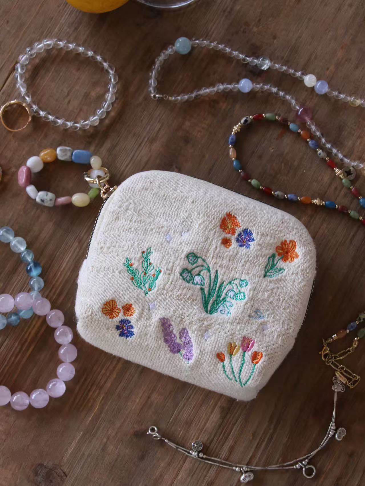 A countryside floral pouch made of soft natural linen-cotton canvas, detailed with exquisite handcrafted wildflower embroidery for timeless pastoral daily style.