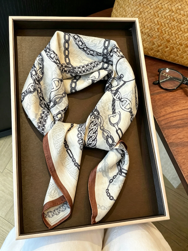 A sophisticated silk scarf with timeless chain-link motifs. Smooth and lustrous, it elevates everyday outfits with subtle luxury and refined detailing.