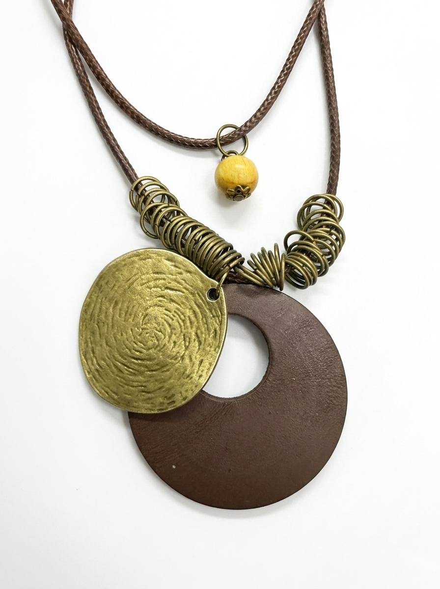 Round wooden pendant layered with vintage-style metal detailing. A statement piece that pairs effortlessly with knits, shirts, or dresses for a relaxed boho look.