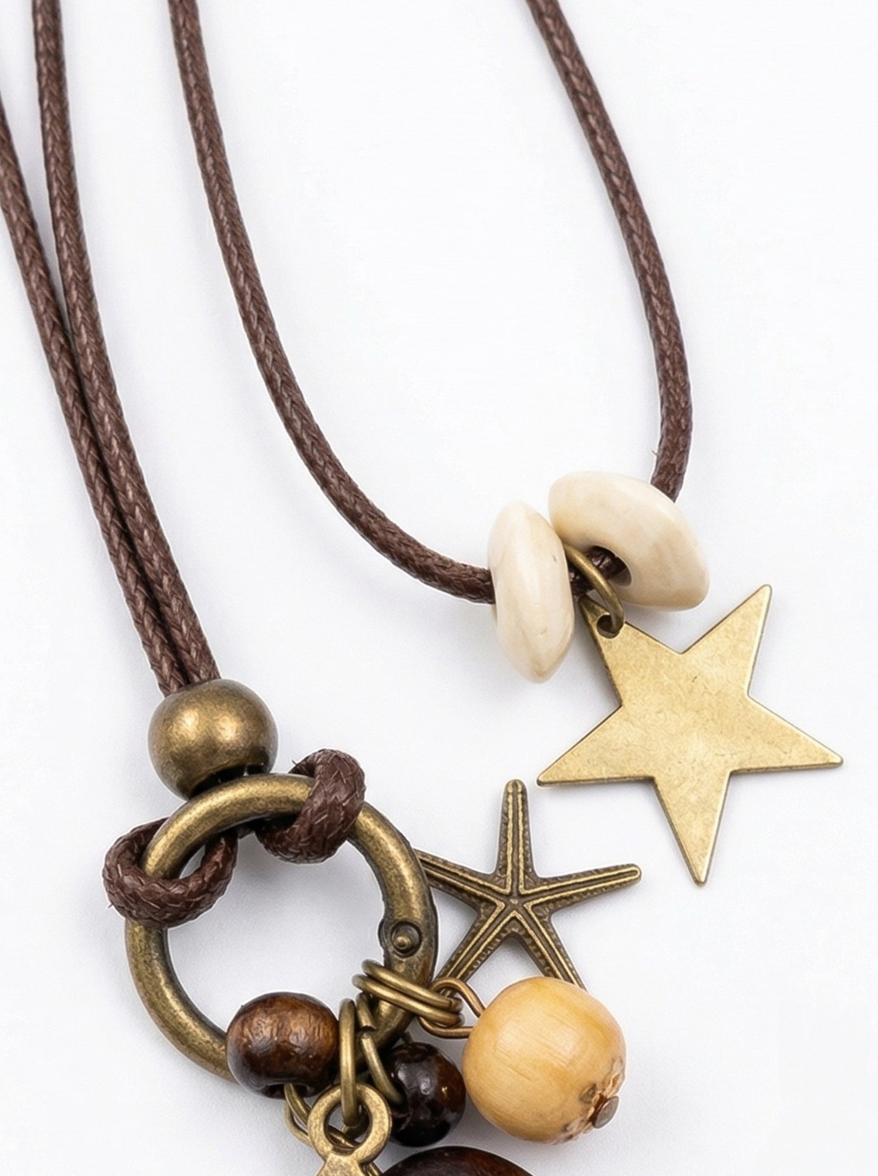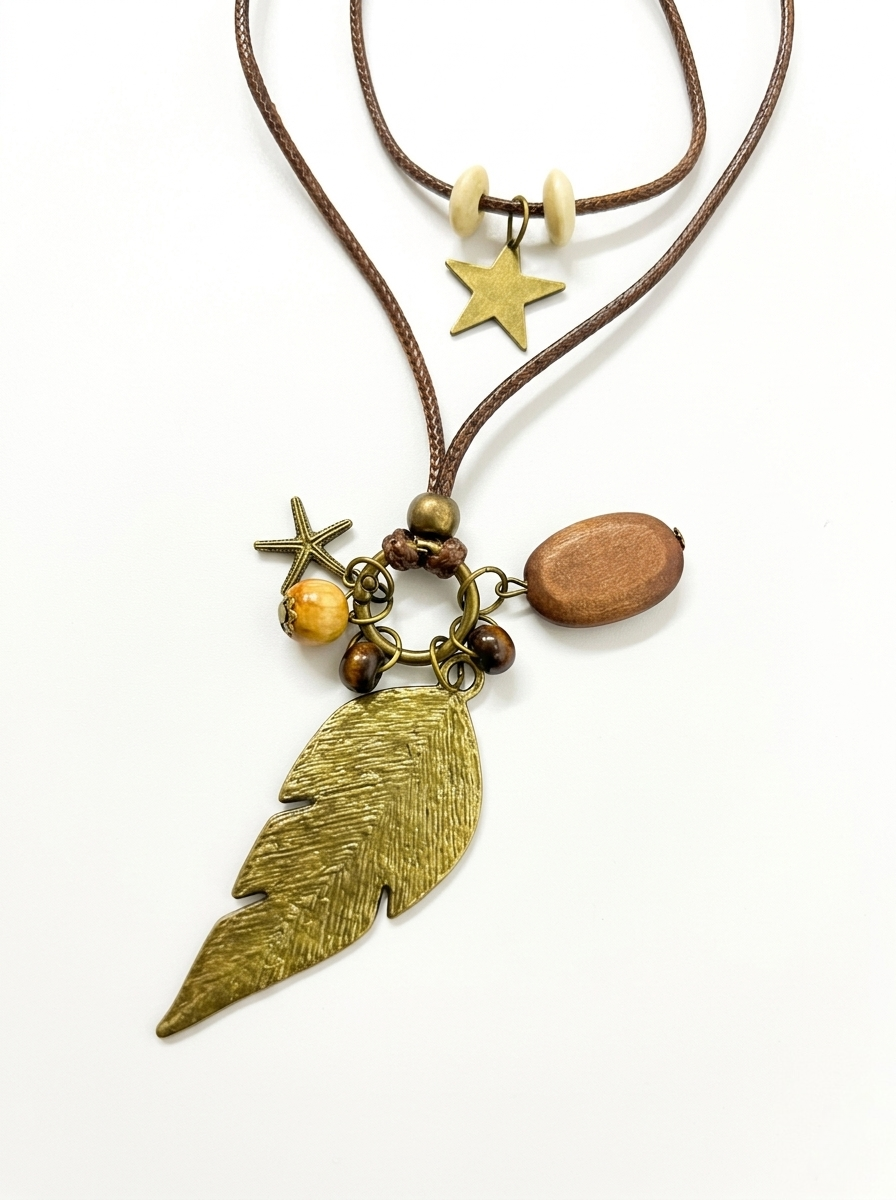 Double-layer necklace featuring leaf, star, and wooden accents. Designed with natural texture and flow, perfect for adding dimension to both casual and seasonal looks.