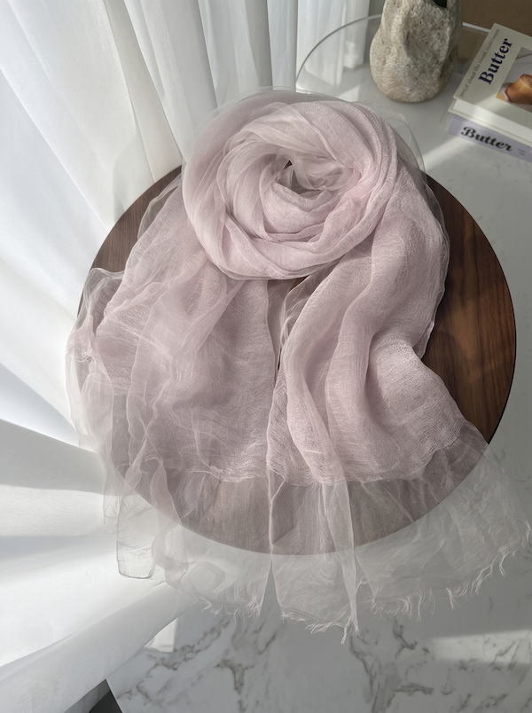 A dreamy, lightweight scarf with an ethereal, soft aesthetic. It drapes beautifully and adds gentle movement to any look.