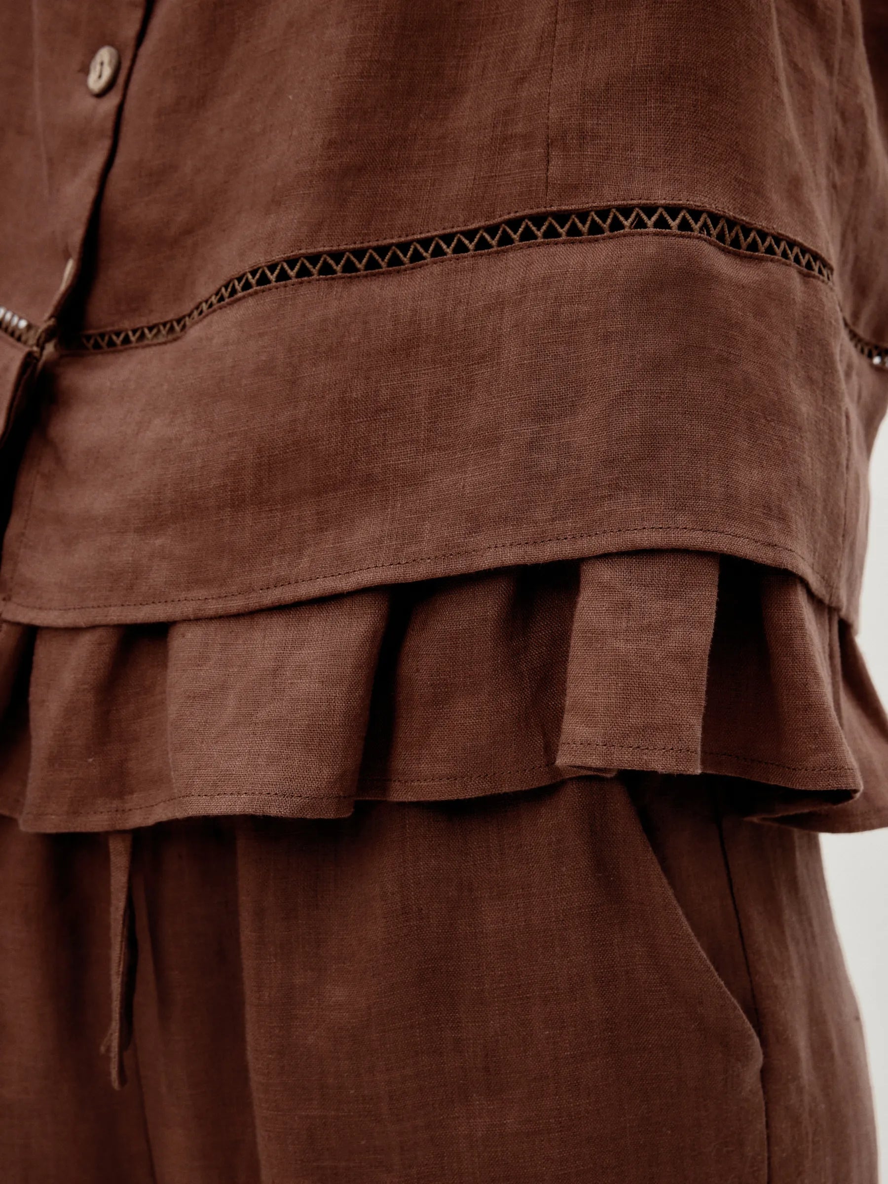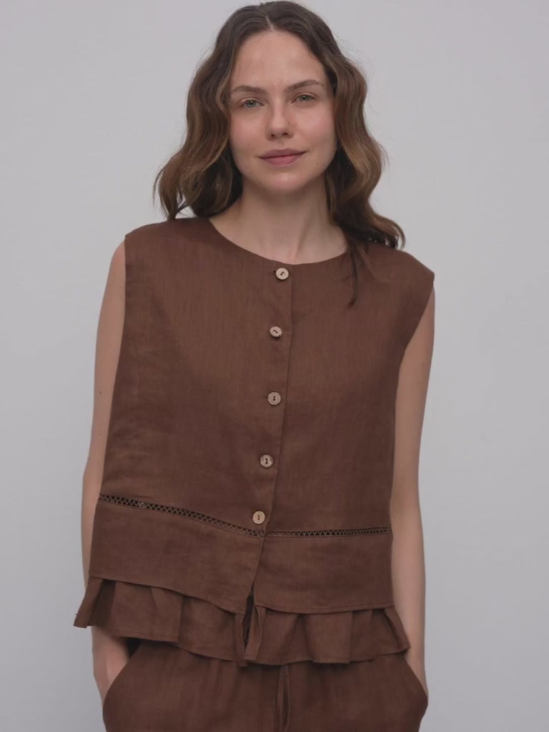 100% Linen Button Down Embroidery Ruffle Hem Tank Top
