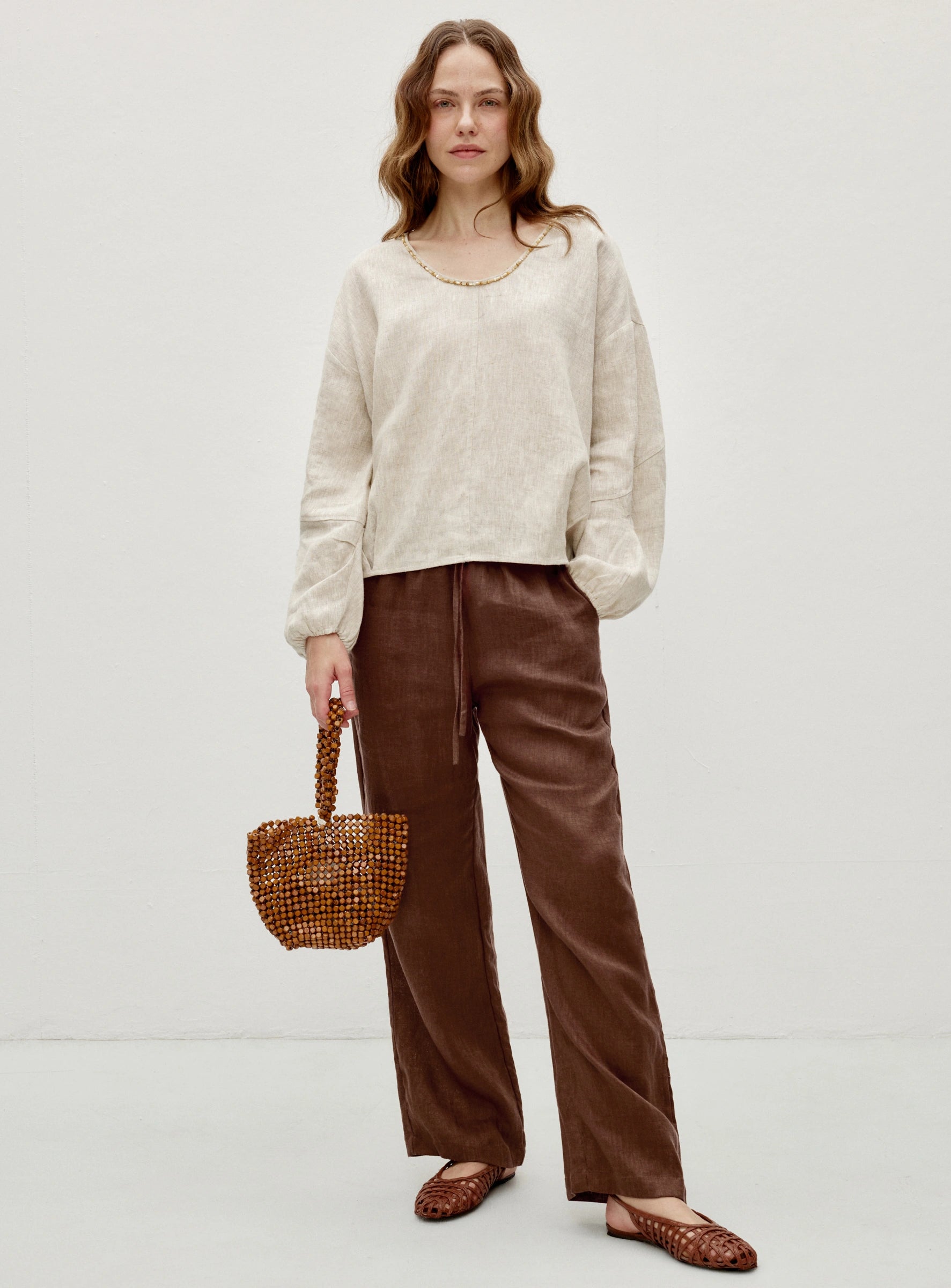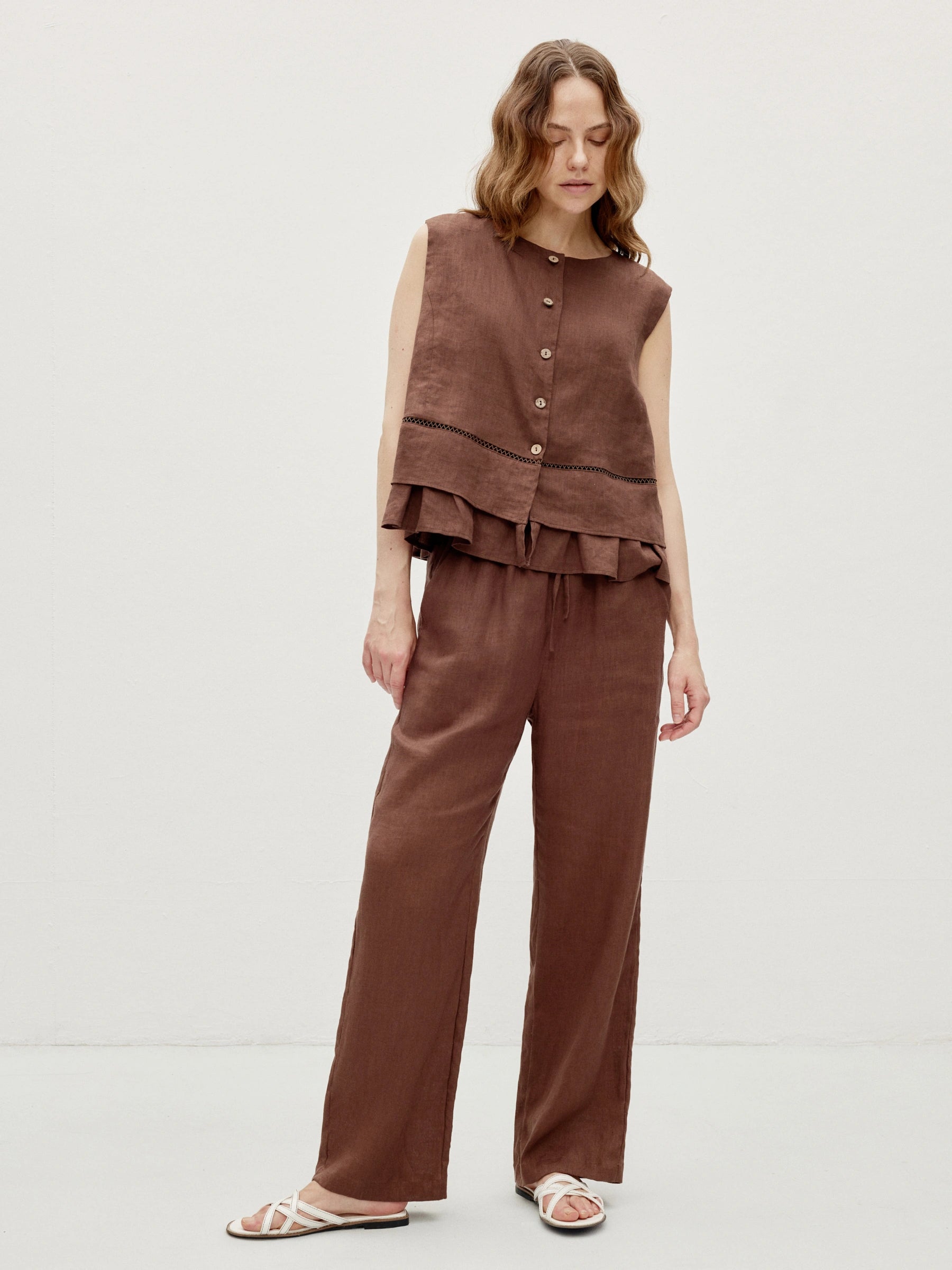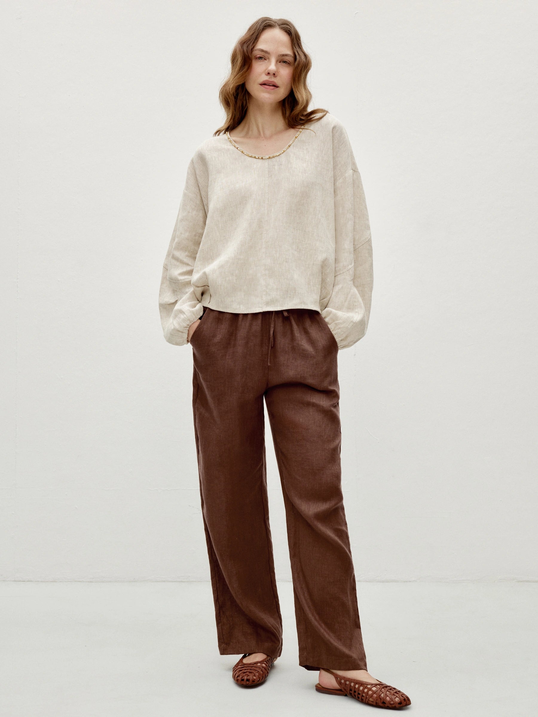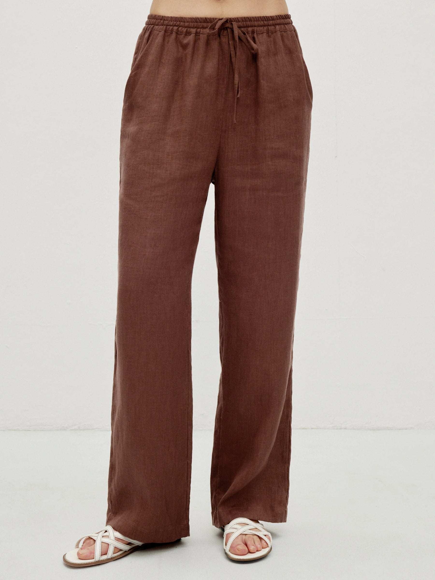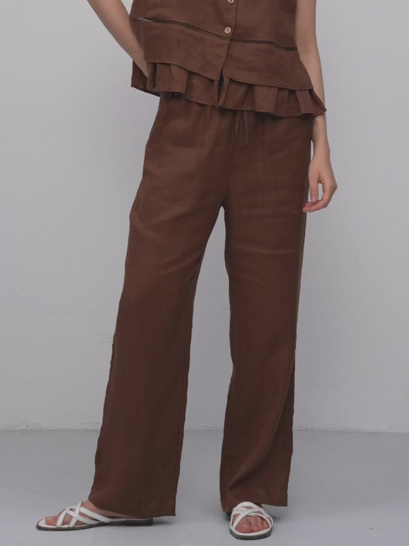 An elastic Waist linen trousers with soft, breathable drape. Straight-leg cut creates a clean silhouette, while an adjustable drawstring waist and side pockets ensure comfort and practicality, ideal for casual daily wear.