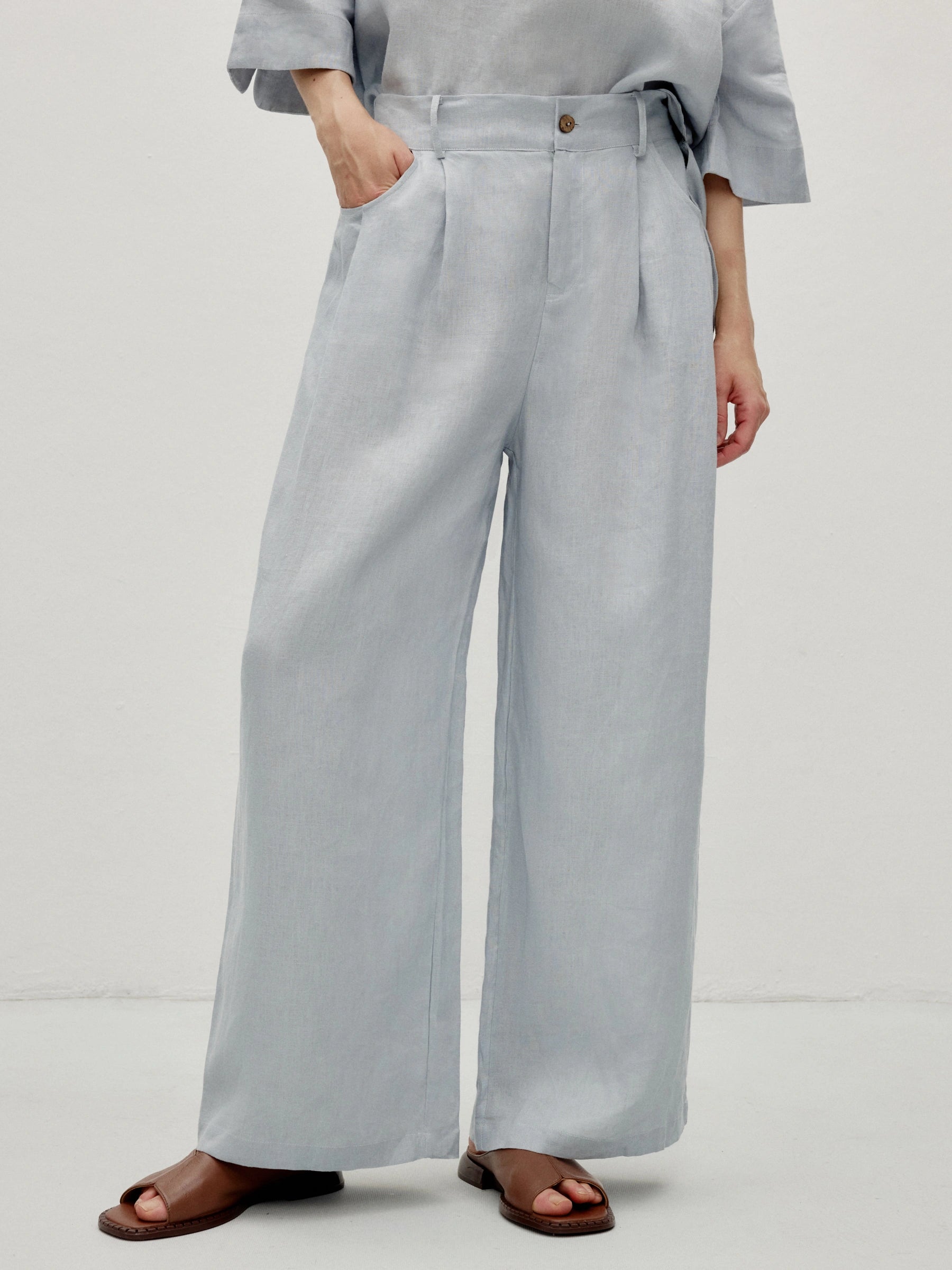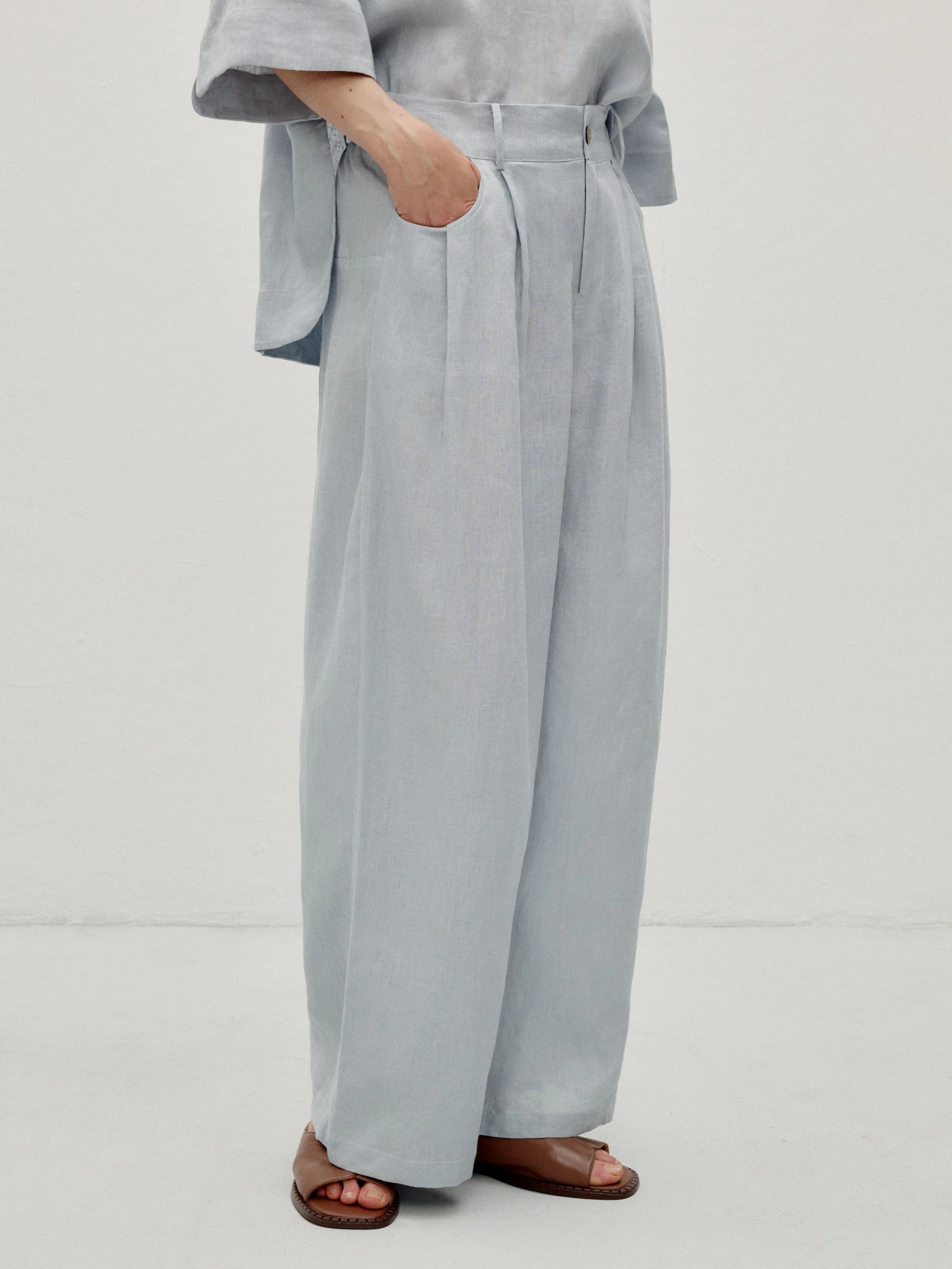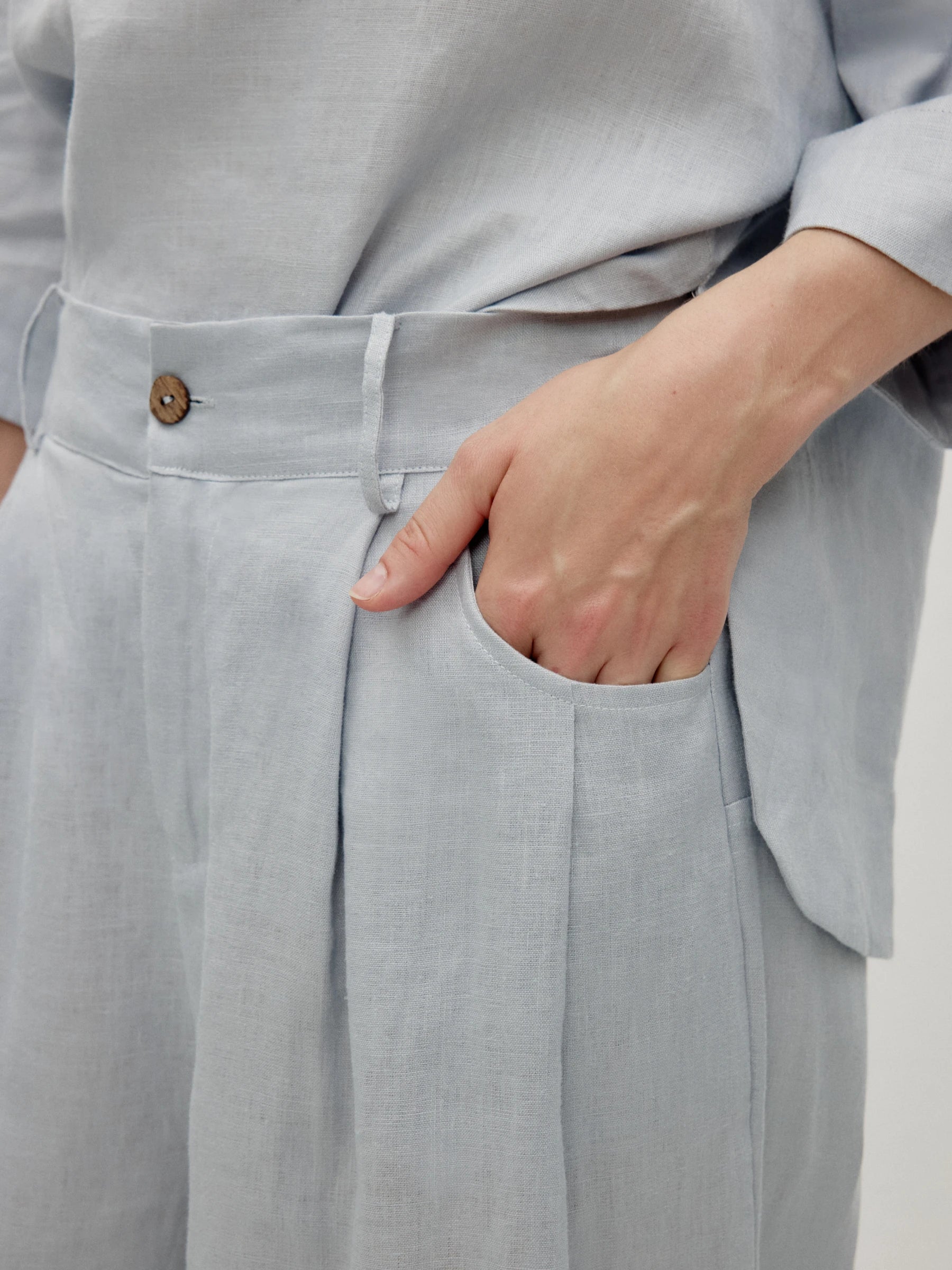 Tailored linen trousers with subtle pleats and premium feel. Zip and button closure for structure. Back elastic adapts to shape. Pleated waistline enhances figure, side pockets practical.