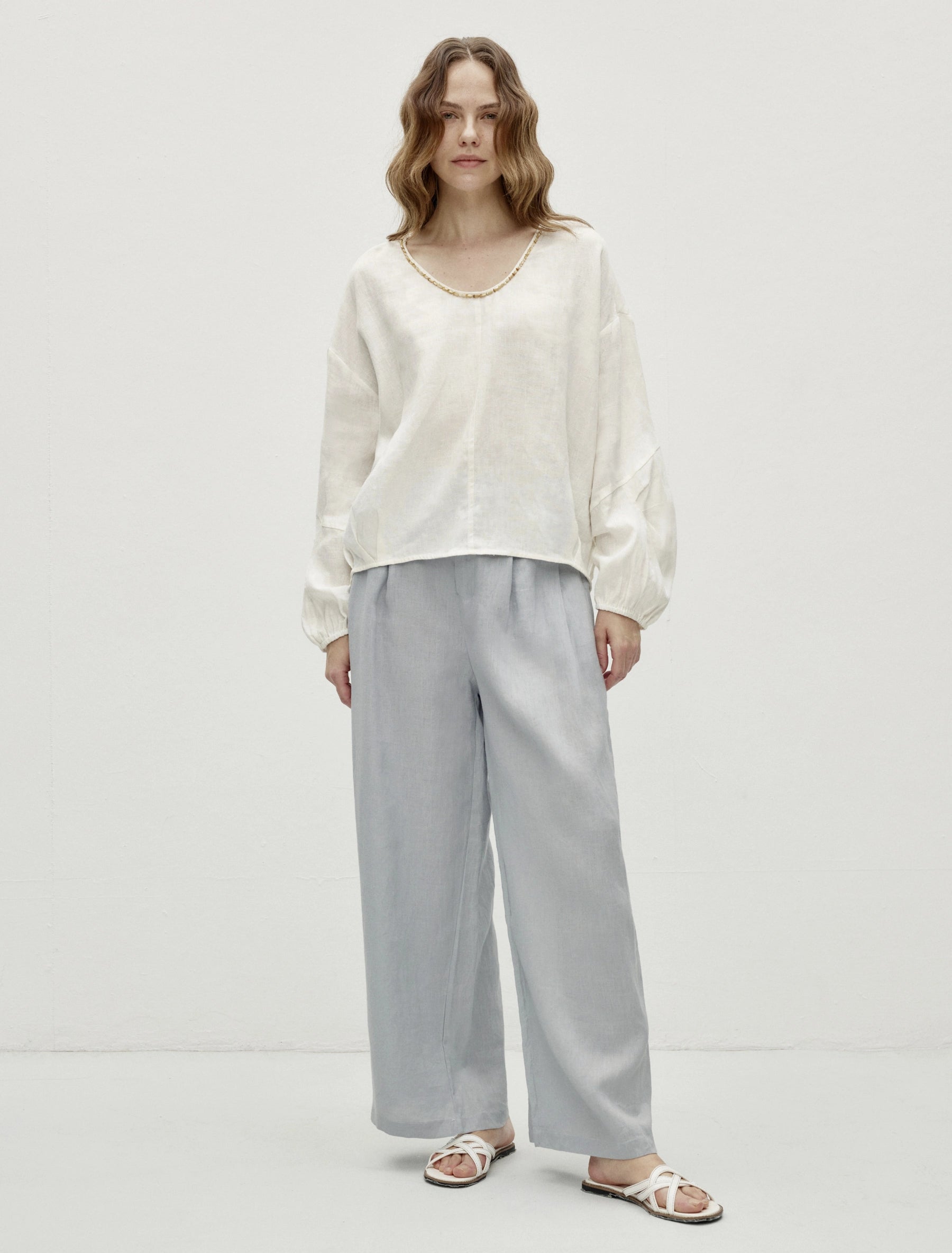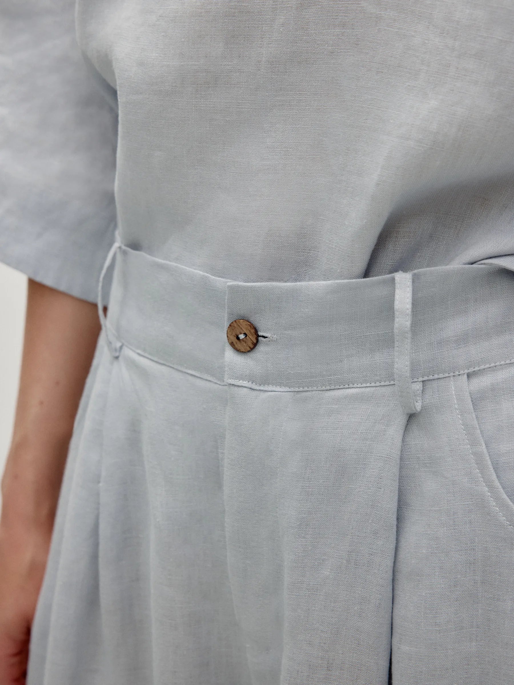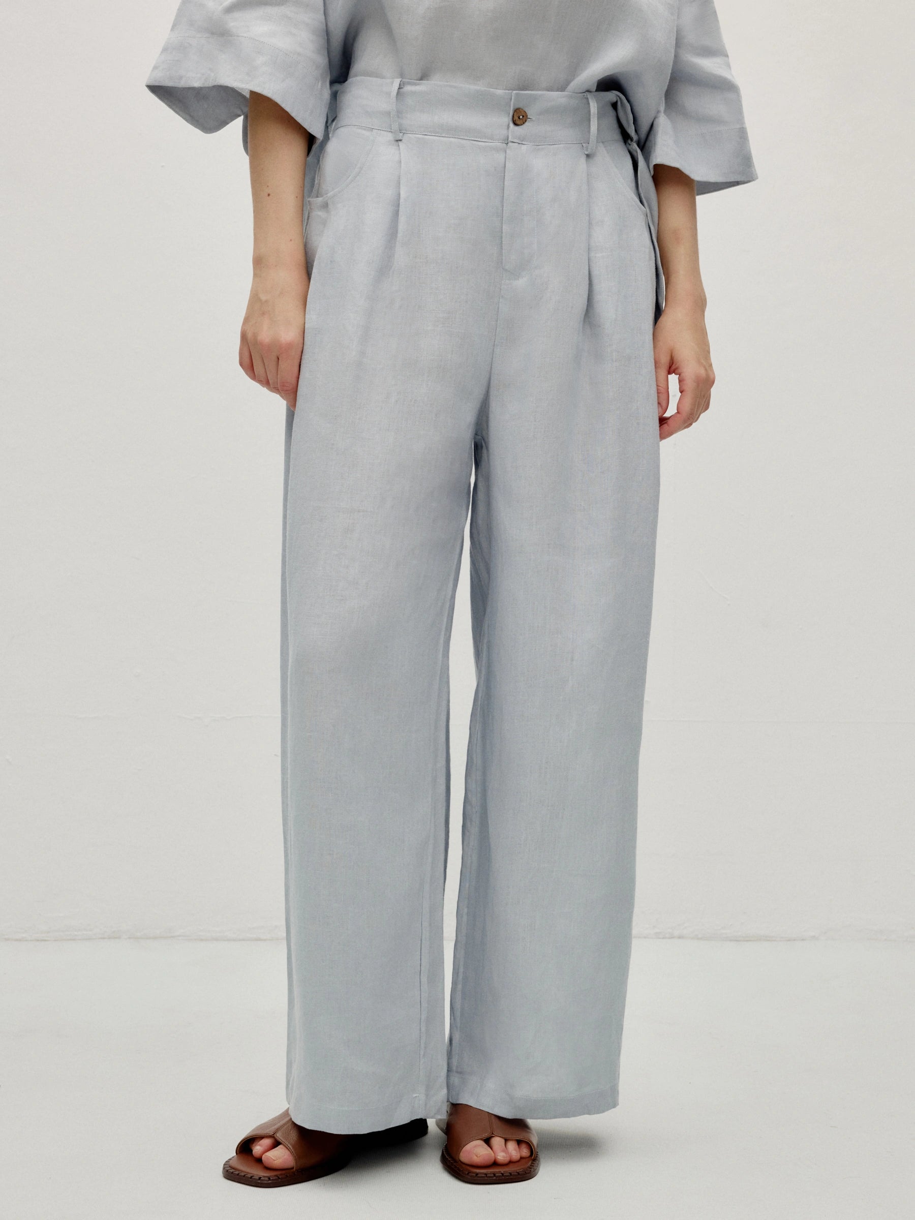 Tailored linen trousers with subtle pleats and premium feel. Zip and button closure for structure. Back elastic adapts to shape. Pleated waistline enhances figure, side pockets practical.