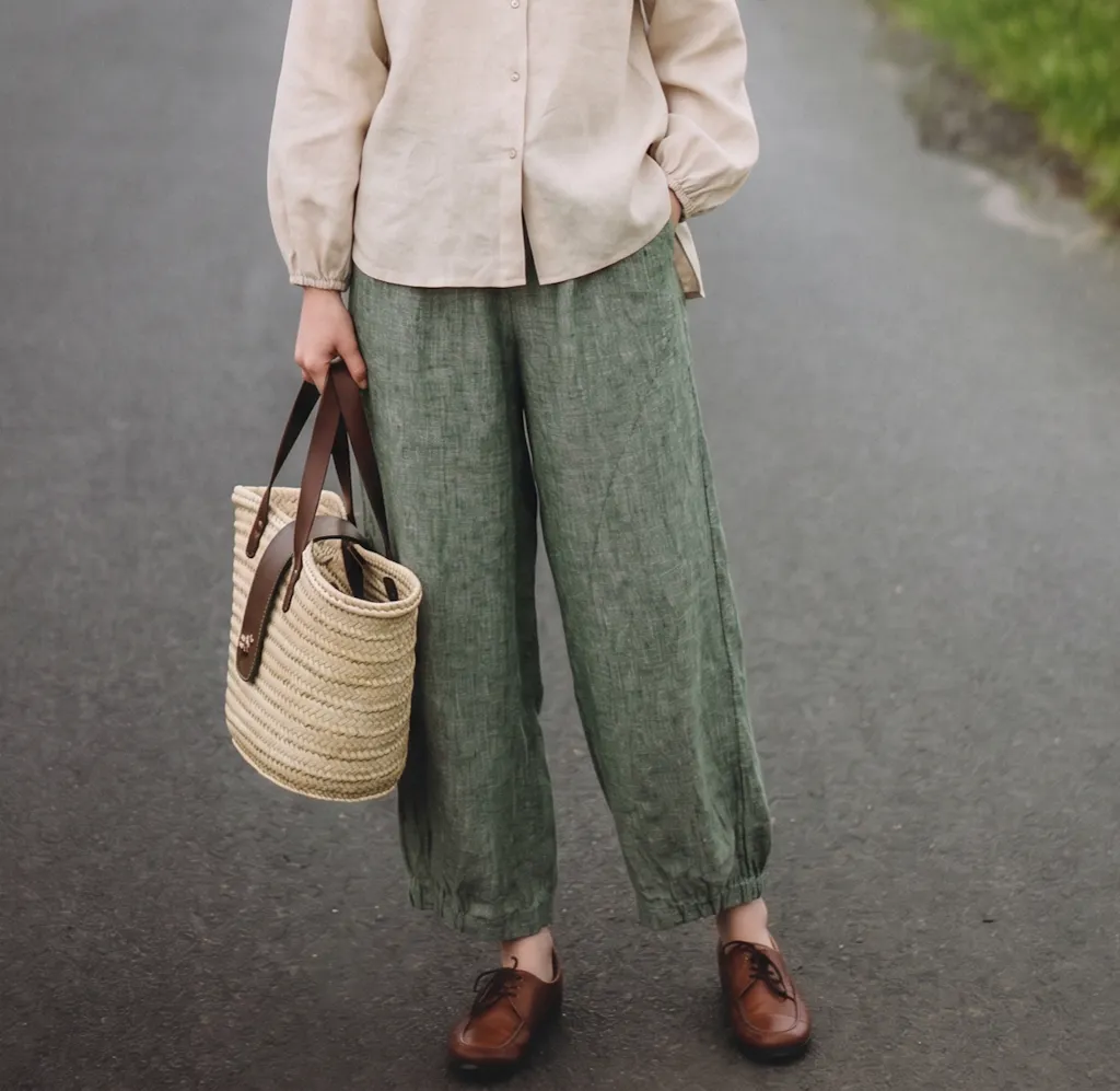 Wide-leg cropped linen trousers with relaxed drape. Elastic waist fits all body types. Flowing wide-leg silhouette. Elastic hem and side pockets for comfort and ease.