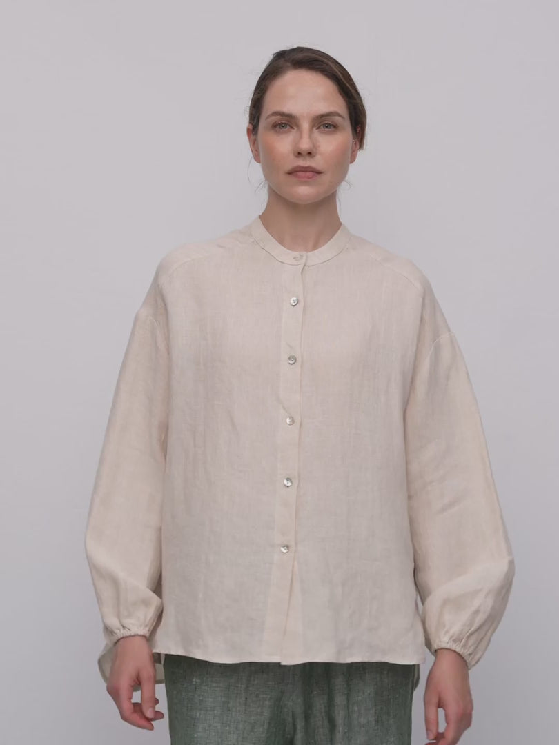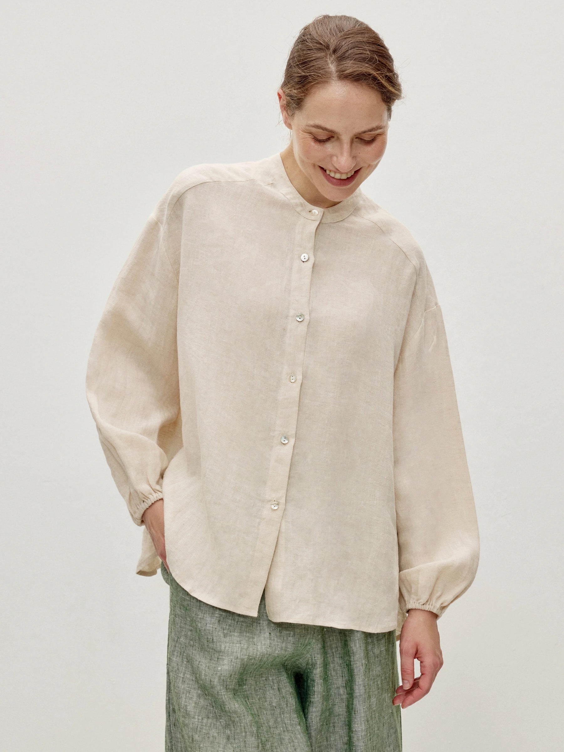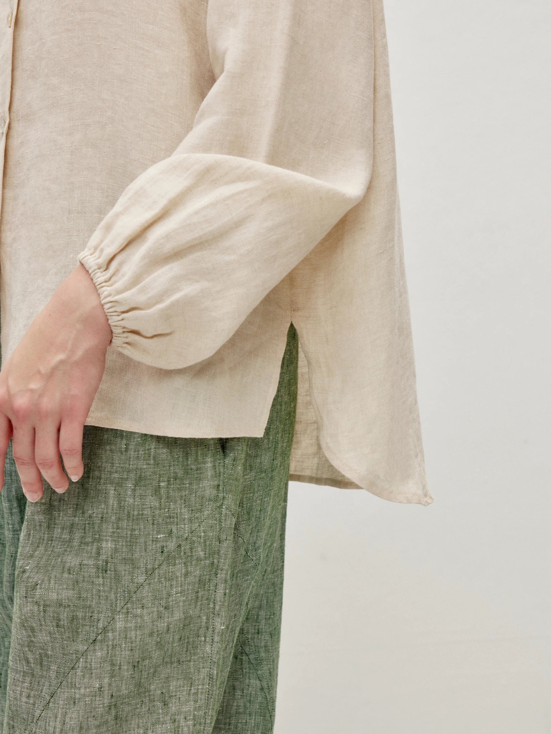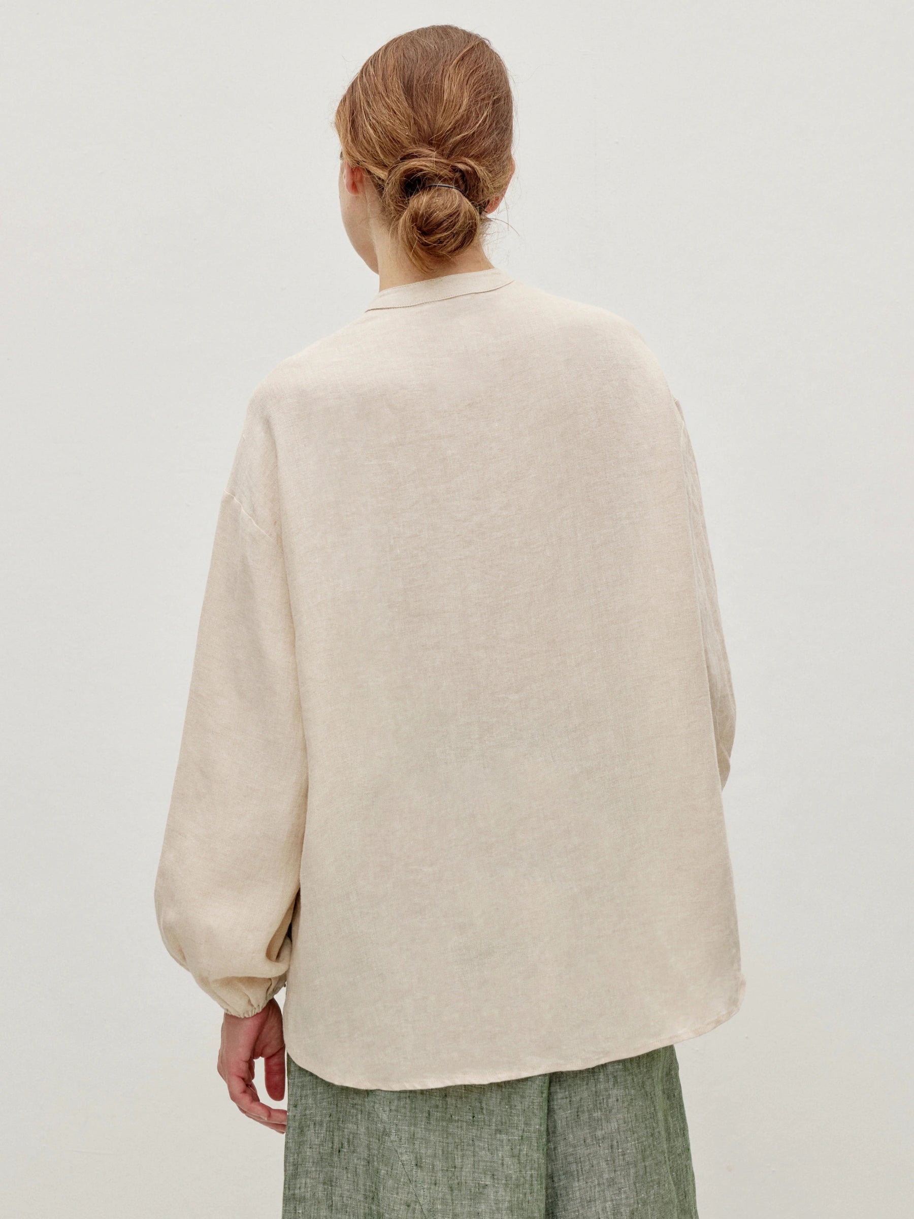 A relaxed linen shirt designed with clean lines and soft structure. The dropped shoulders and adjustable cuffs create an easy, versatile piece for layering or wearing on its own.