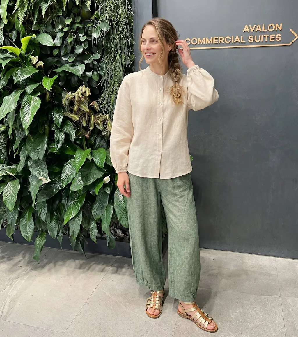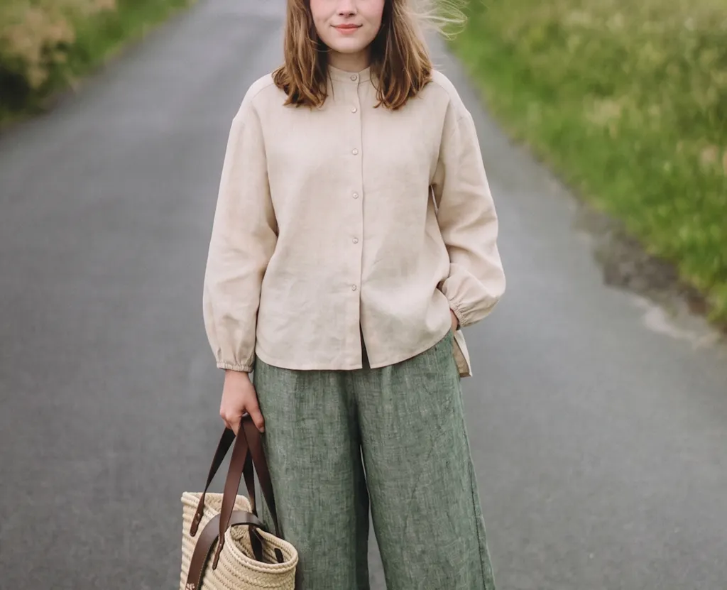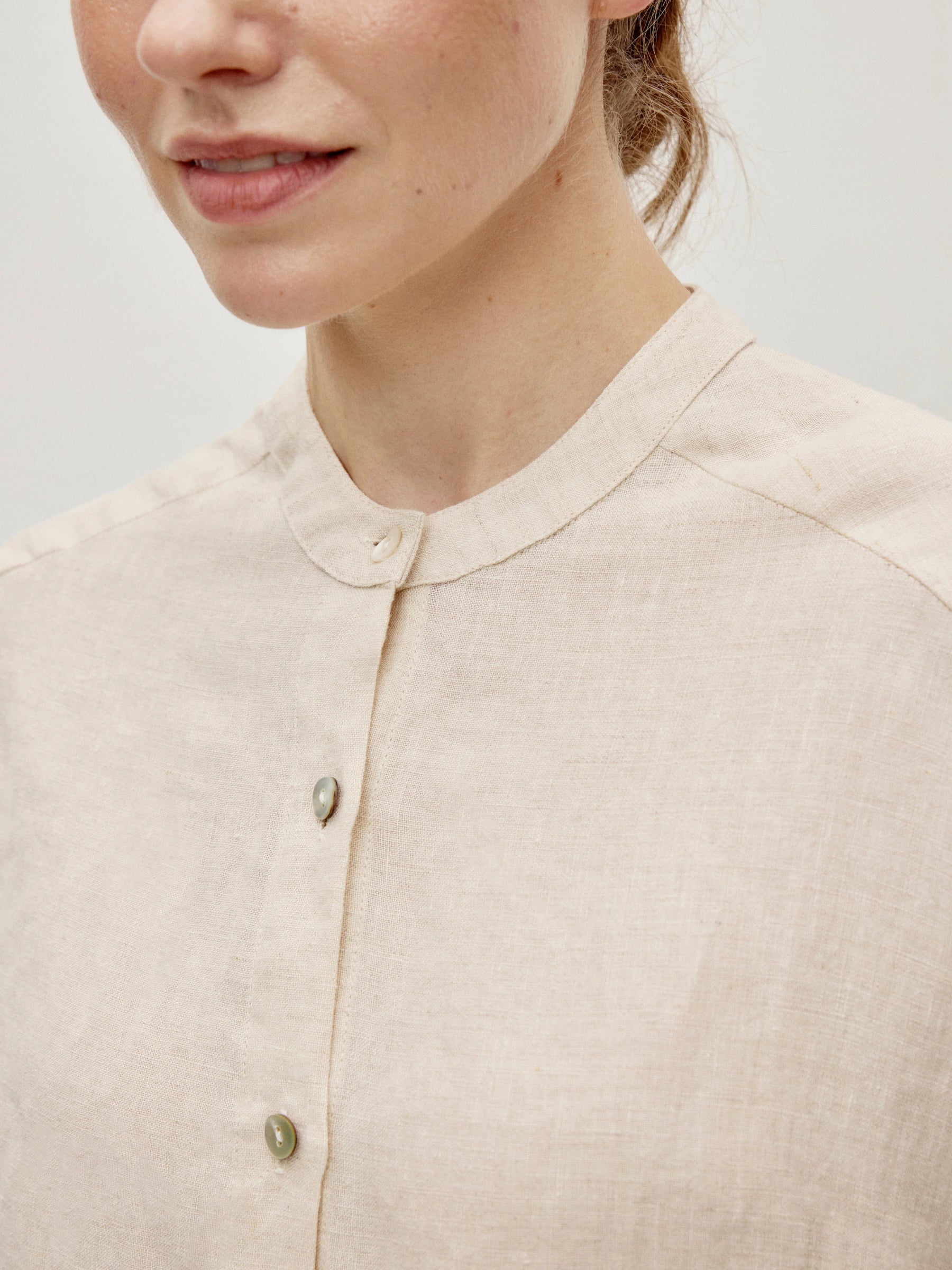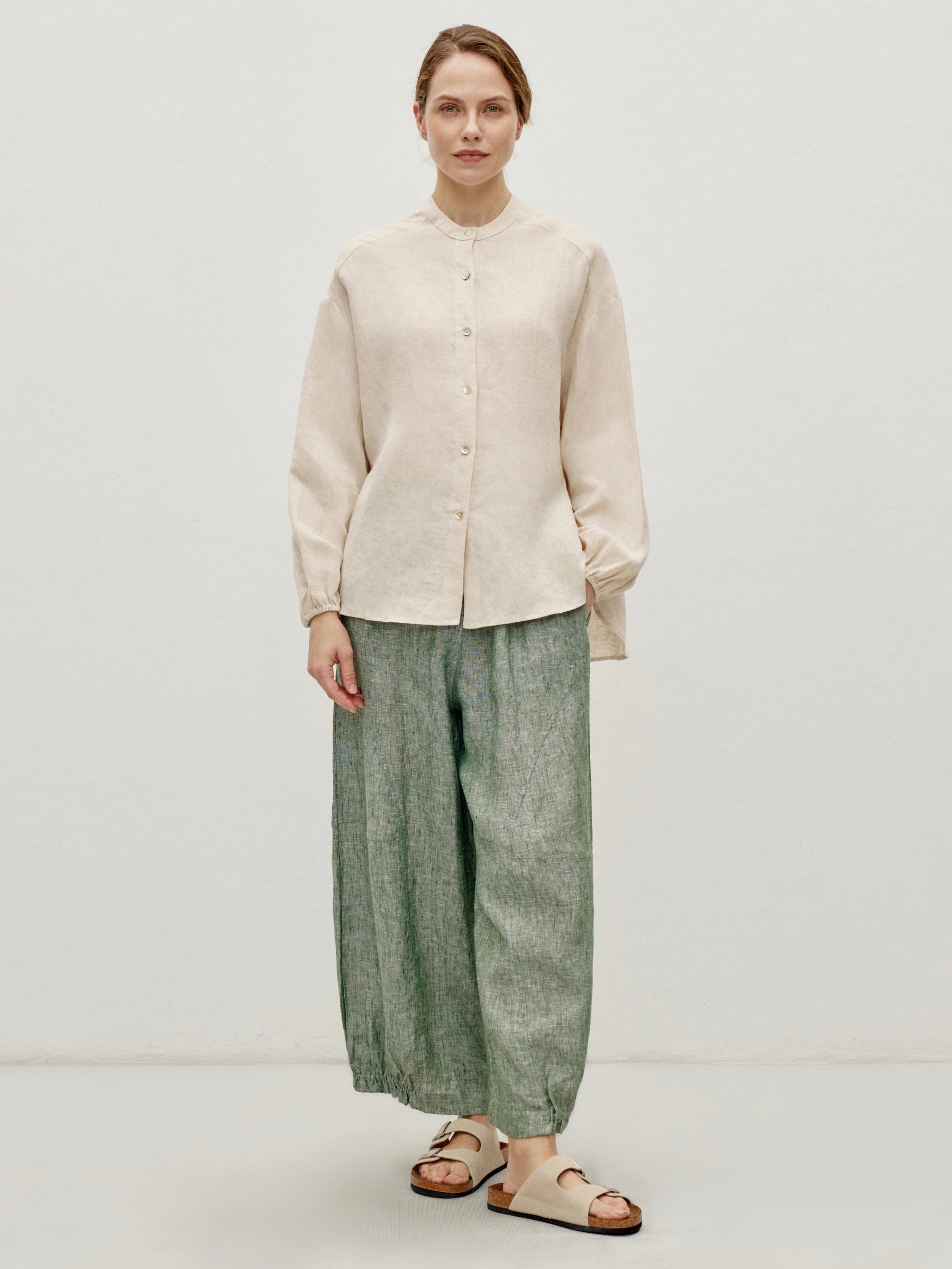 A relaxed linen shirt designed with clean lines and soft structure. The dropped shoulders and adjustable cuffs create an easy, versatile piece for layering or wearing on its own.
