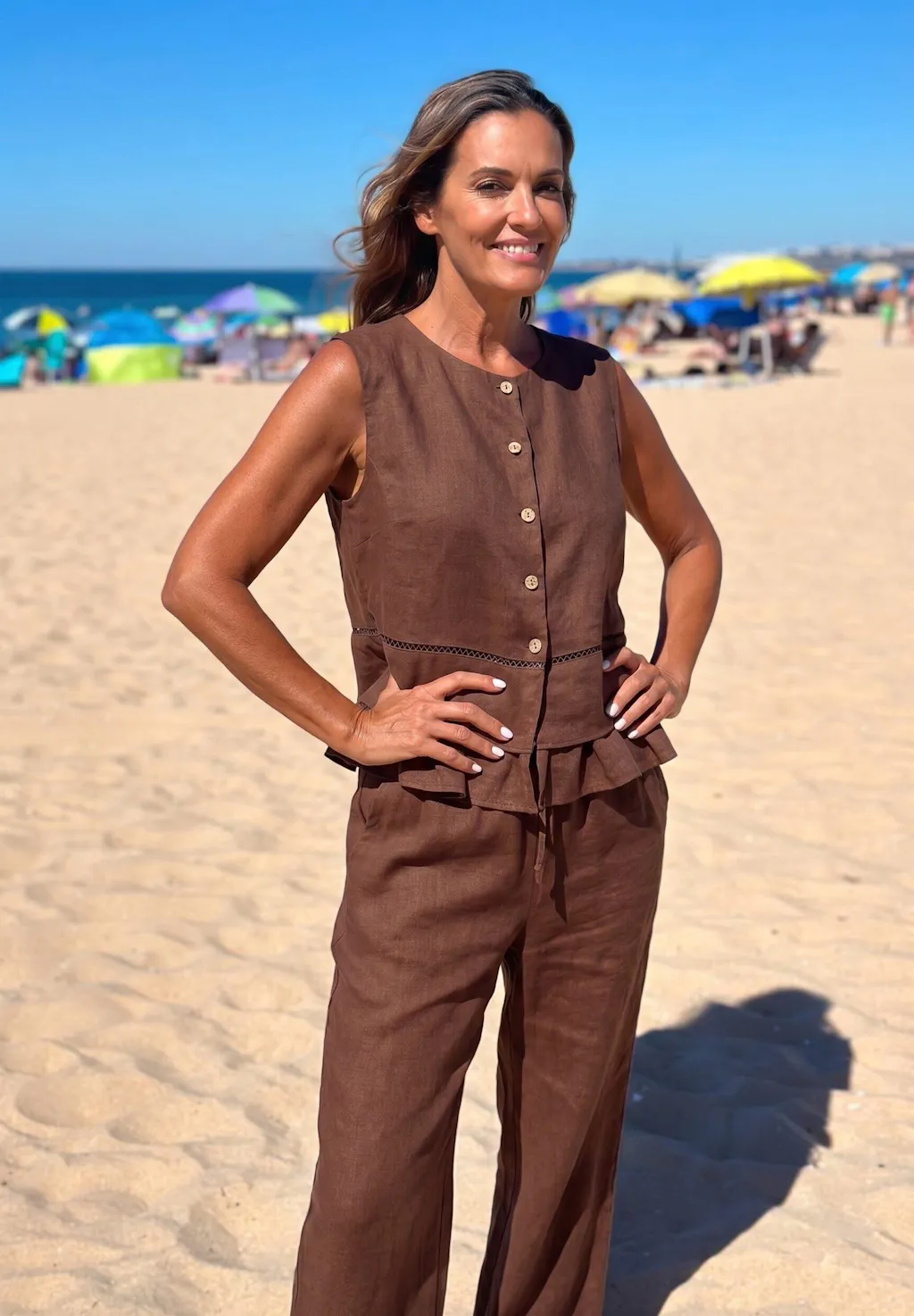 Refined sleeveless linen top with a soft, breathable drape and subtle natural sheen. Layered pleats and embroidery hem create texture and depth, while the H-line silhouette gently skims the body for a flattering, comfortable fit.