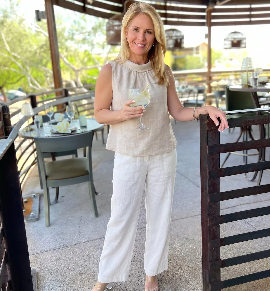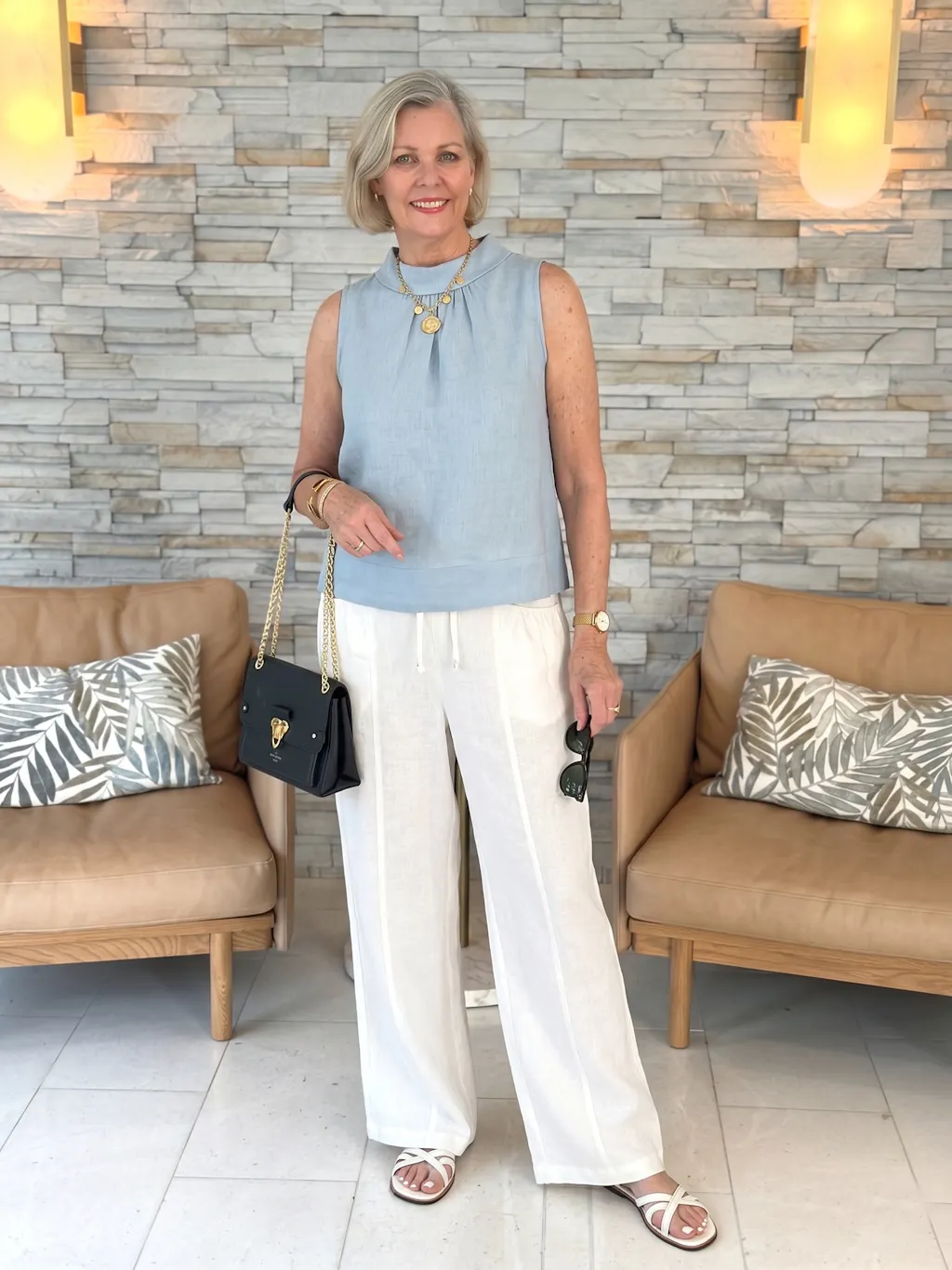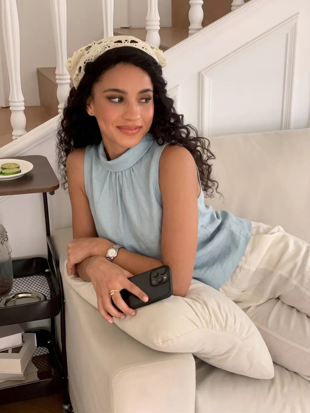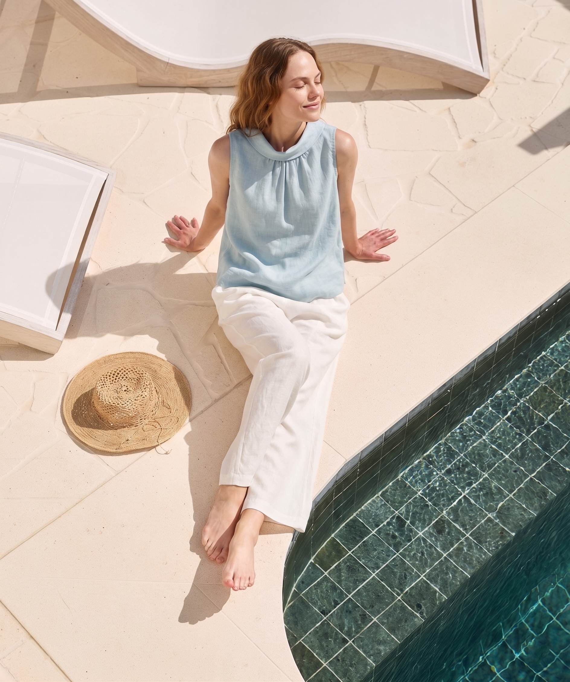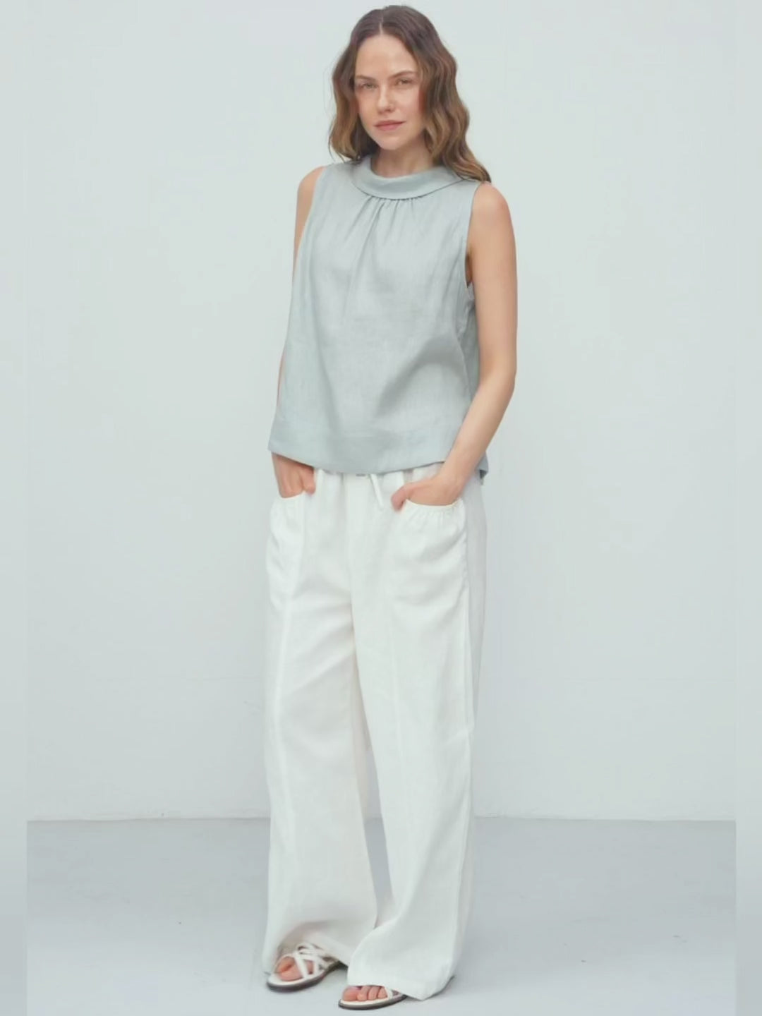 A sleeveless linen top with smooth texture and reversible styling. Reversible design offers styling flexibility. Fold-over collar with shell button for refined detail. Sleeveless wide hem flatters figure, breezy and light.