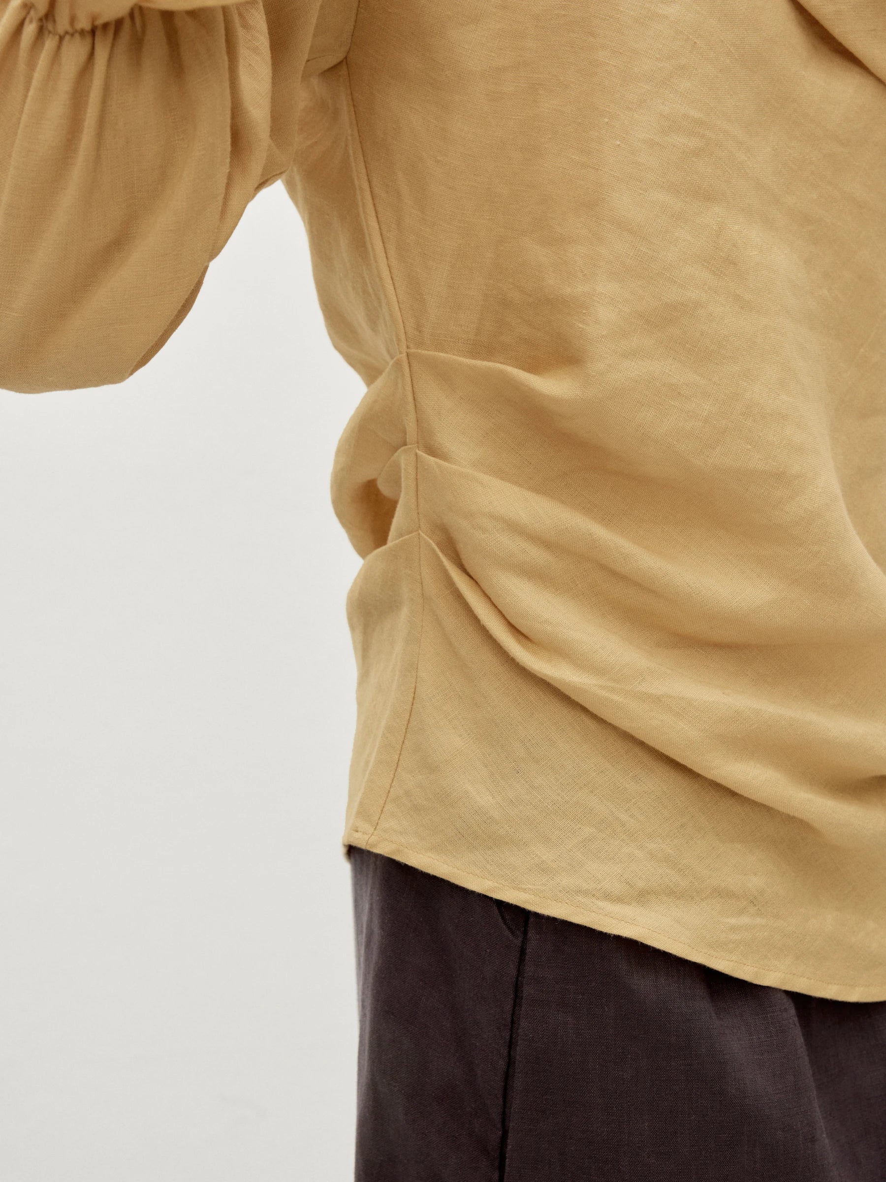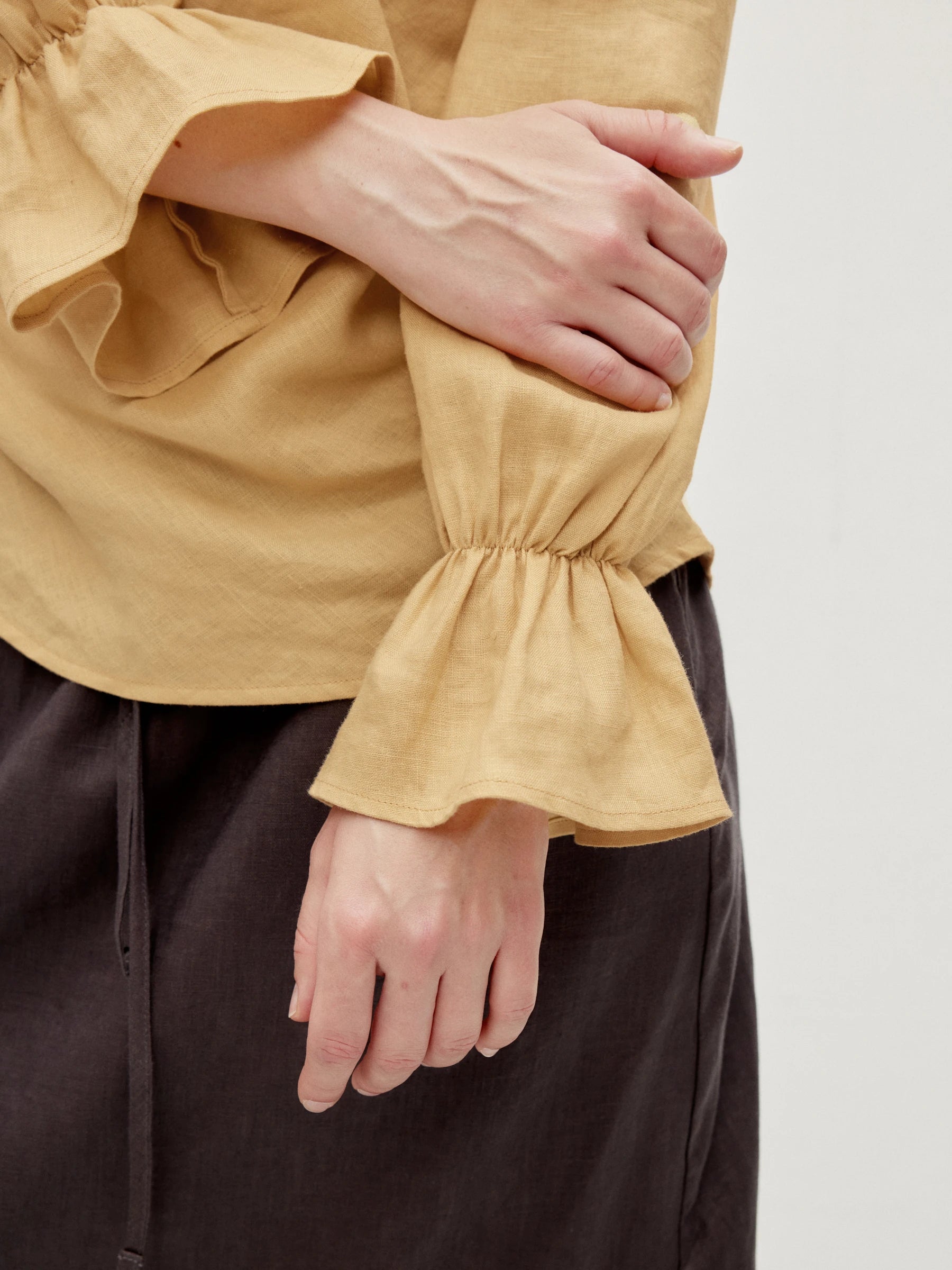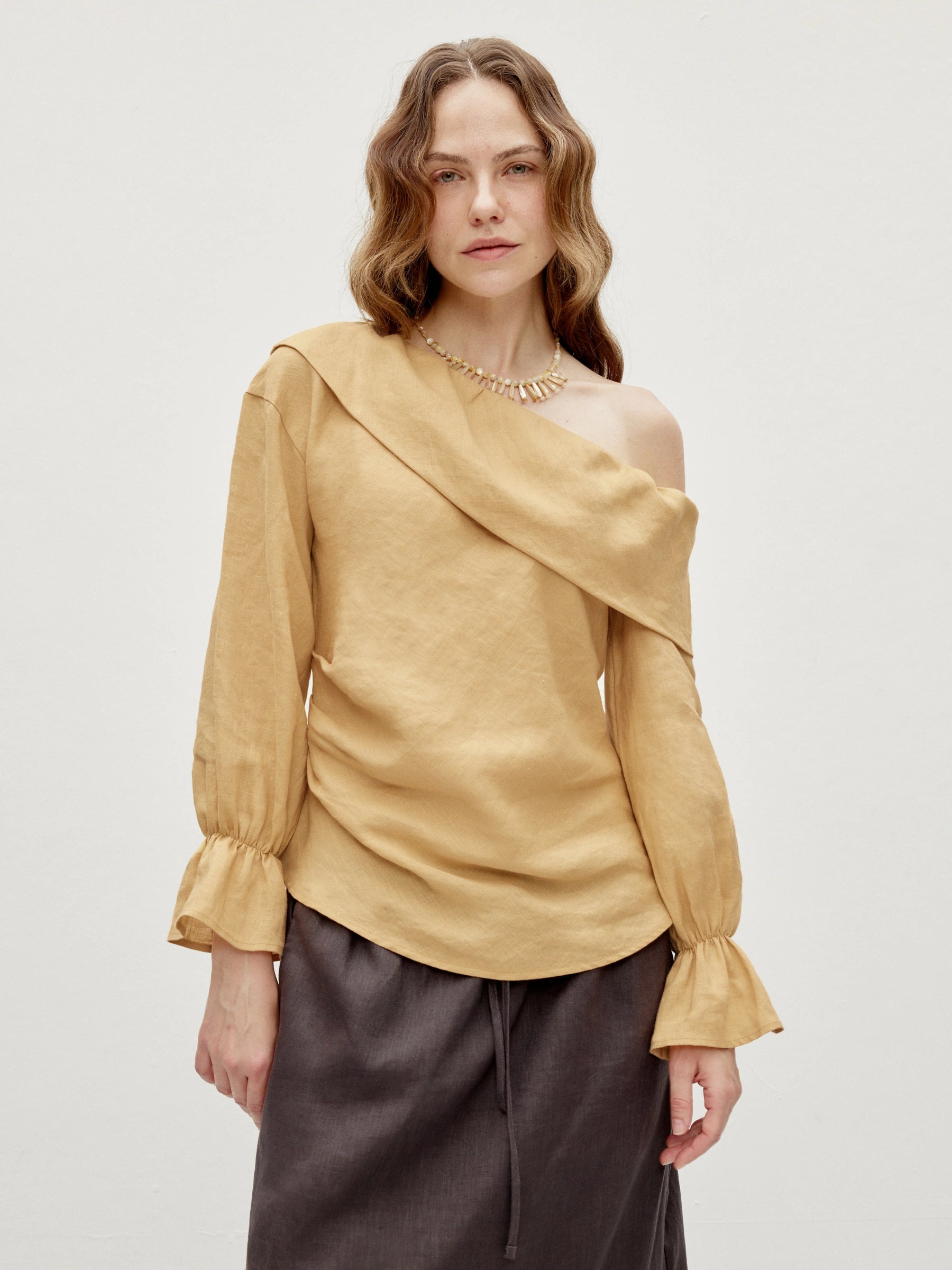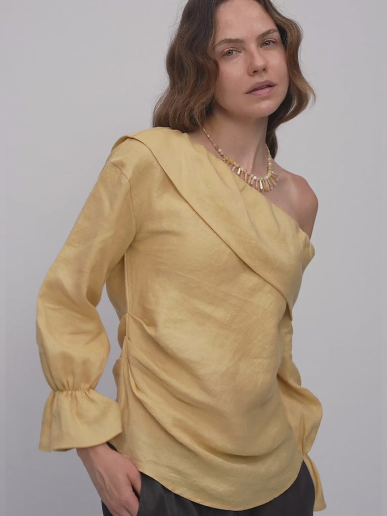 Refined linen blouse with a soft, natural drape and a subtle, luxurious sheen. The asymmetrical collar flows gracefully, while gentle waist-cinching pleats define the silhouette. Delicate ruffled cuffs add a quiet, sophisticated finish.