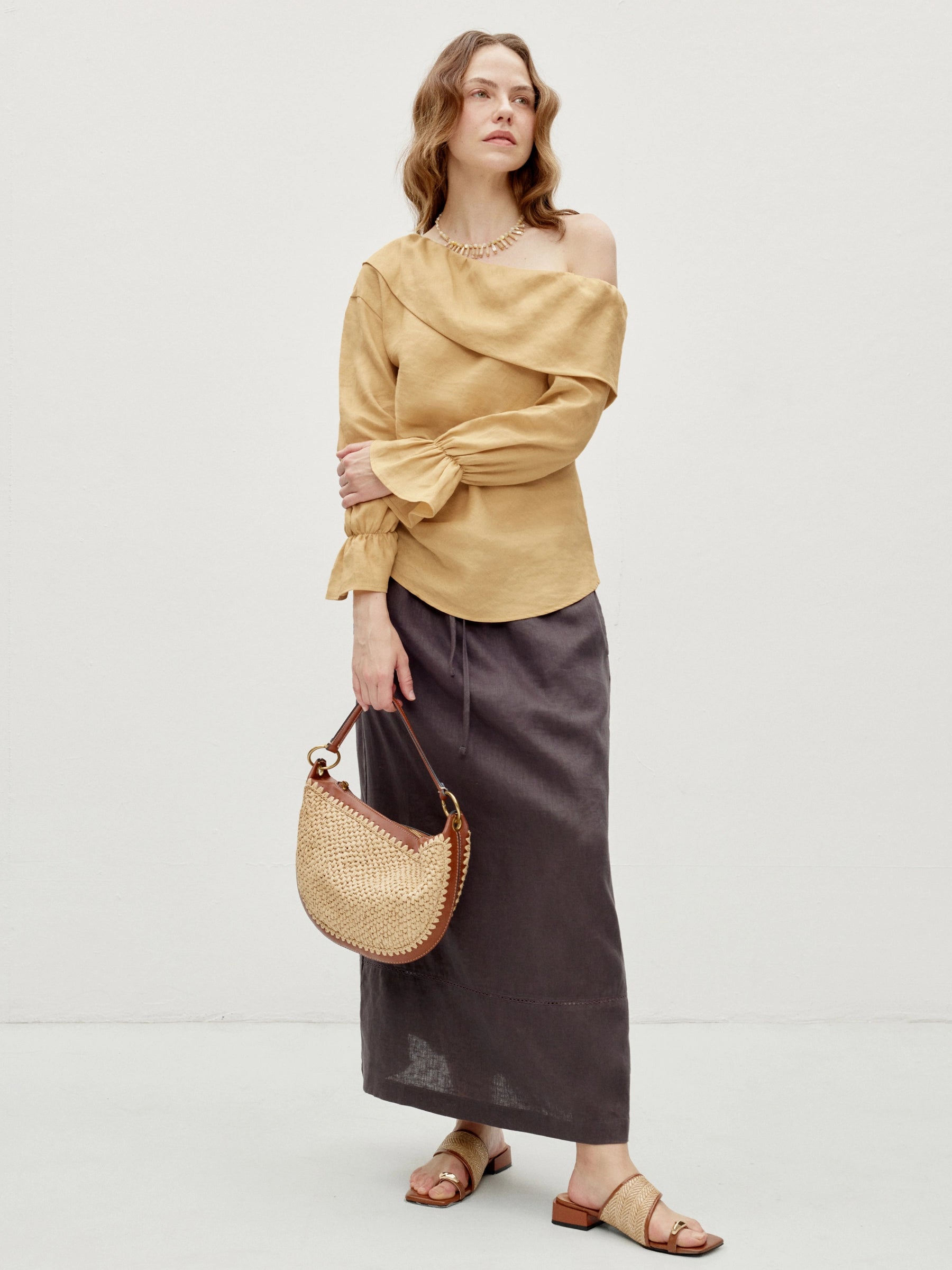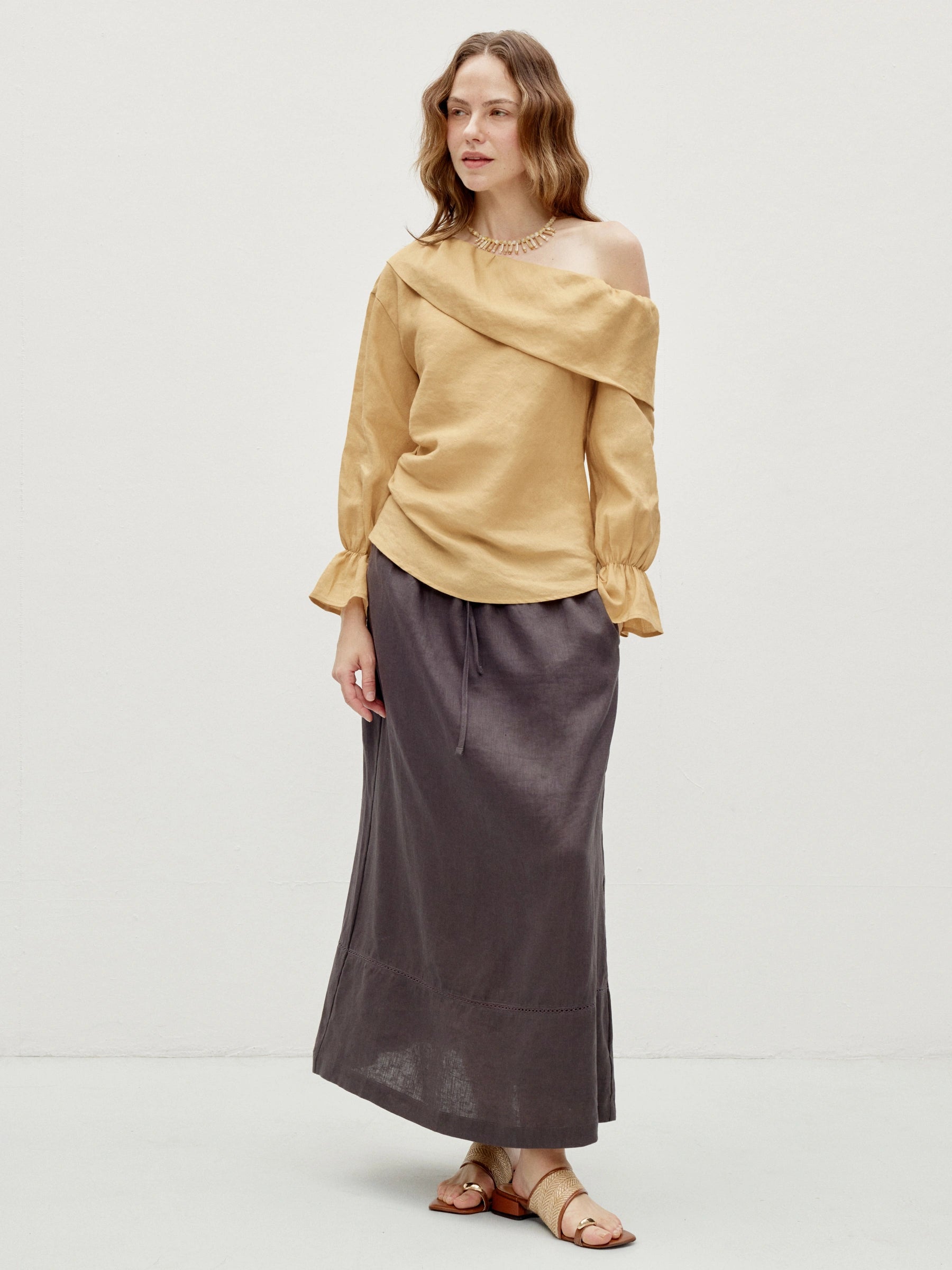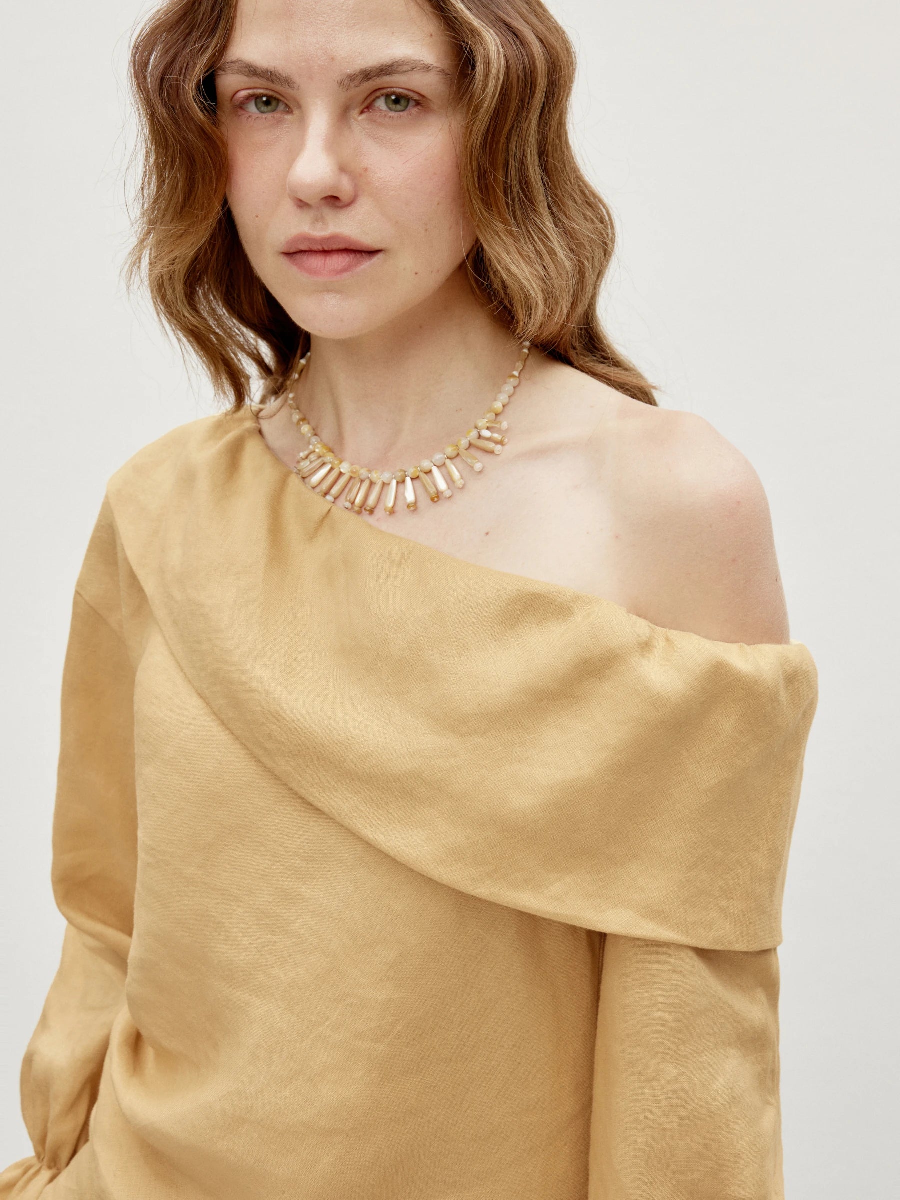Refined linen blouse with a soft, natural drape and a subtle, luxurious sheen. The asymmetrical collar flows gracefully, while gentle waist-cinching pleats define the silhouette. Delicate ruffled cuffs add a quiet, sophisticated finish.