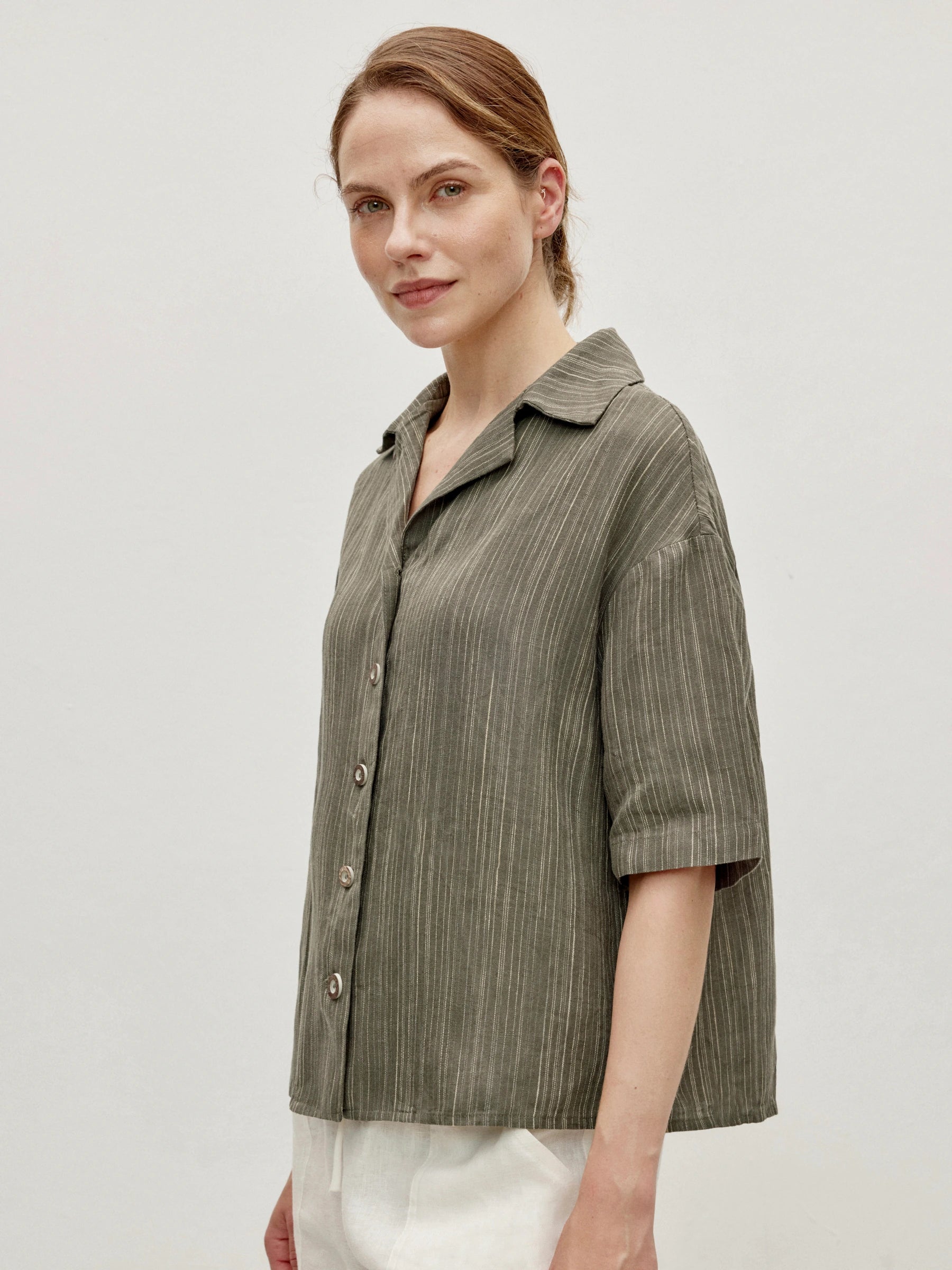 100% Linen Stripe Cuban Collar Half Sleeve Shirt
