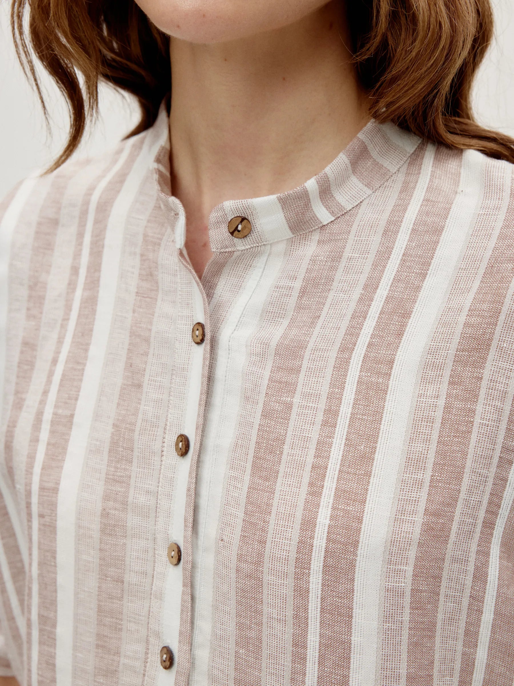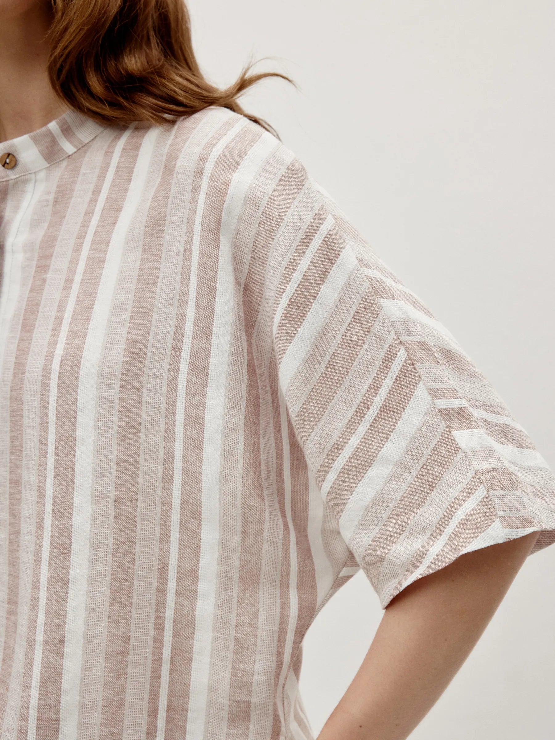 Structured linen blouse with a soft, breathable drape and refined texture. A stand collar elegantly frames the neckline, while wide half sleeves offer comfort and ease. Side slit hem and dual side pockets enhance movement and practical functionality.